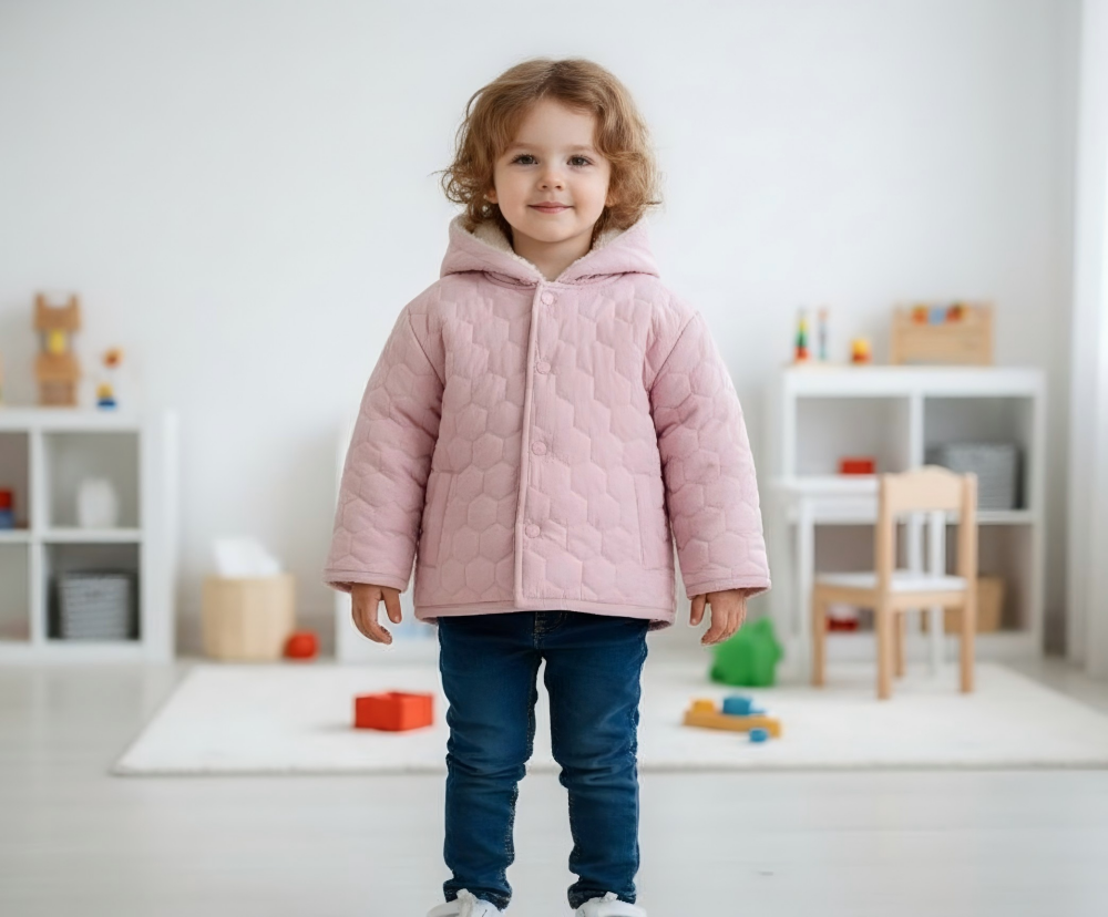- Features: DTM bottons and two side seam pockets, Quilted hexagon-shape or vertically,Special designs for Kids